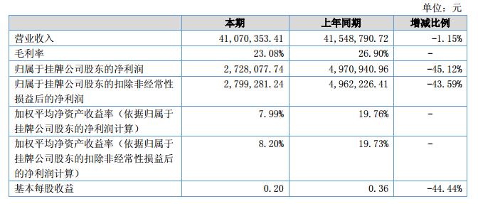 報告期內(nèi)公司實現(xiàn)營業(yè)收入41,070,353.41元,同比下降1.15%;利潤總額和凈利潤分別為2,974,085.29元和2,736,207.66元,較上年同期下降47.1%和45.59%。?