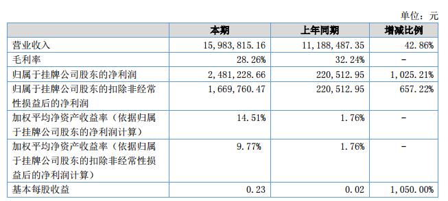 報(bào)告期內(nèi),公司實(shí)現(xiàn)營(yíng)業(yè)收入1,598.38萬(wàn)元,較上年同期1,118.85萬(wàn)元同比增長(zhǎng)42.86%;實(shí)現(xiàn)凈利潤(rùn)248.12萬(wàn)元,較上年同期22.05萬(wàn)元同比增長(zhǎng)1,025.21%。?