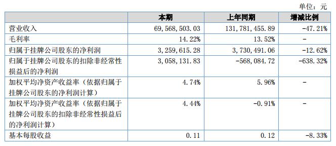 報告期內(nèi)實(shí)現(xiàn)營業(yè)收入6,956.85萬元,實(shí)現(xiàn)凈利潤325.96萬元。報告期綜合毛利率為14.22%,較上年同期略有上升。報告期內(nèi)公司總資產(chǎn)為19,654.11萬元,同比下降8.47%,凈資產(chǎn)7,043.63萬元,同比增加4.85%。?