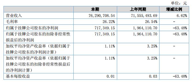 公司在報(bào)告期內(nèi)的主營(yíng)業(yè)務(wù)收入為7629.07萬元,比上年同期增長(zhǎng)6.62%;營(yíng)業(yè)成本為5256.78萬元,比上年度增長(zhǎng)7.08%;歸屬于母公司的凈利潤(rùn)為71.73萬元,比上年同期下降63.48%。?