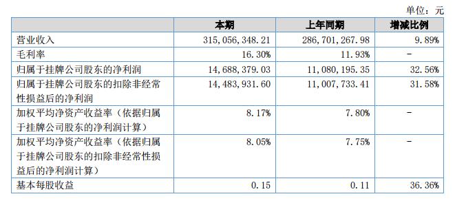 報告期內(nèi),實現(xiàn)營業(yè)收入315,056,348.21萬元,同比增長9.89%,實現(xiàn)歸屬于母公司股東的凈利潤14,688,379.03萬元,同比增長32.56%。?