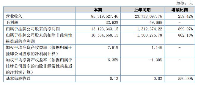報(bào)告期內(nèi)公司實(shí)現(xiàn)營業(yè)收入8,531.95萬元,較上年同期增長259.42%;歸屬于掛牌公司股東的凈利潤1,312.33萬元,較上年同期增長899.97%。