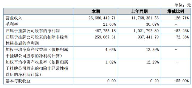 公司實(shí)現(xiàn)的營業(yè)收入為26,680,442.71元,較上年同期增加14,912,061.13元;截至報(bào)告期末,公司的營業(yè)成本為20,902,843.63元,較上年同期增加12,672,889.40元;報(bào)告期內(nèi)公司管理費(fèi)用為4,337,655.47元,較上年同期增加了2,531,186.04元;報(bào)告期內(nèi),公司凈利潤487,755.18元,較上年同期減少了534,037.62元。
