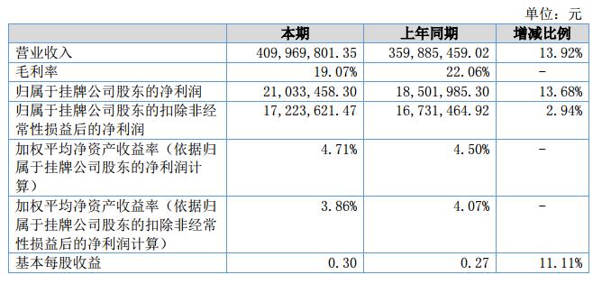 公司在報(bào)告期內(nèi)的營(yíng)業(yè)收入為409,969,801.35元,比上年度增長(zhǎng)13.92%;營(yíng)業(yè)成本為331,777,394.18元,比上年度增長(zhǎng)18.29%;歸屬于母公司的凈利潤(rùn)為21,033,458.30元,比上年度增長(zhǎng)13.68%。?