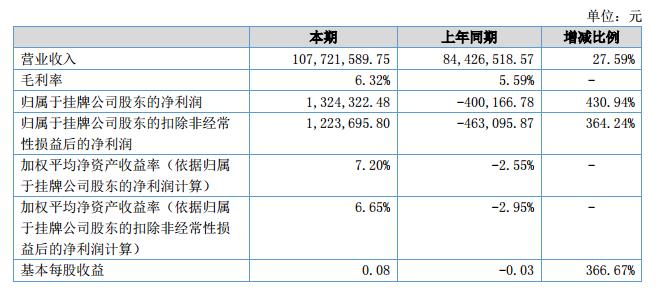 報(bào)告期內(nèi),公司主營業(yè)務(wù)收入為107,721,589.75元,較去年同期增長27.59%;歸屬于掛牌公司股東的凈利潤為1,324,322.48元,而去年同期為-400,166.78元,主要因?yàn)闃I(yè)務(wù)增加導(dǎo)致公司業(yè)績大幅改善。歸屬于掛牌公司股東的每股凈資產(chǎn)為1.2元,較去年同期增長7.14%。?