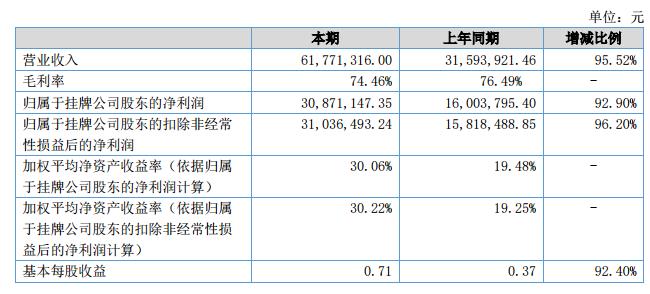 報告期內(nèi),公司實現(xiàn)營業(yè)收入6,177.13萬元,與上年同期相比增長95.52%;凈利潤方面:報告期內(nèi)公司實現(xiàn)凈利潤3,087.11萬元,較去年同期1,600.38萬元增長92.90%。?
