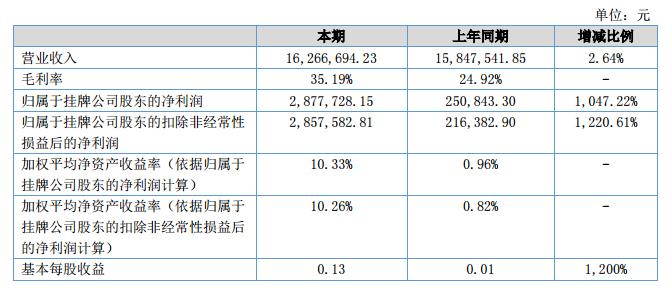 報告期內(nèi),公司實現(xiàn)營業(yè)收入16,266,694.23元,較上年同期增長2.64%;營業(yè)成本為10,541,749.97,較去年減少11.40%;凈利潤2,877,728.15元,較上年同期增長比例1,047.22%。?