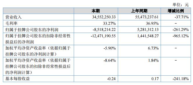 報(bào)告期內(nèi),公司實(shí)現(xiàn)營(yíng)業(yè)收入3,455.23萬(wàn)元,比上年同期降低37.71%;歸屬于掛牌公司股東的凈利潤(rùn)-851.82萬(wàn)元,比上年同期降低261.29%。截至2018年6月30日,總資產(chǎn)為20,974.32萬(wàn)元,總資產(chǎn)增長(zhǎng)率3.87%,歸屬于母公司凈資產(chǎn)為14,985.08萬(wàn)元。?