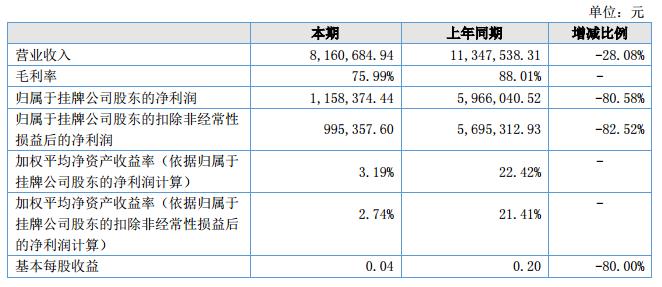 報(bào)告期內(nèi),公司實(shí)現(xiàn)營(yíng)業(yè)收入8,160,684.94元,較上年同期減少28.08%,主要原因系公司大客戶(hù)中國(guó)食品藥品檢驗(yàn)院自2018年開(kāi)始對(duì)供應(yīng)商政策采取競(jìng)標(biāo)模式,政策執(zhí)行初期,其內(nèi)部采購(gòu)結(jié)算流程不明確,致使報(bào)告期內(nèi)對(duì)其銷(xiāo)售收入減少了52.42%。歸屬于掛牌公司股東的凈利潤(rùn)1,158,374.44元,較上年同期減少80.58%,報(bào)告期內(nèi)營(yíng)業(yè)收入比同期減少28.08%,毛利率因研發(fā)創(chuàng)新等投入的增加減少了12.02%,收入和毛利率的減少是影響凈利潤(rùn)減少的主要原因。?