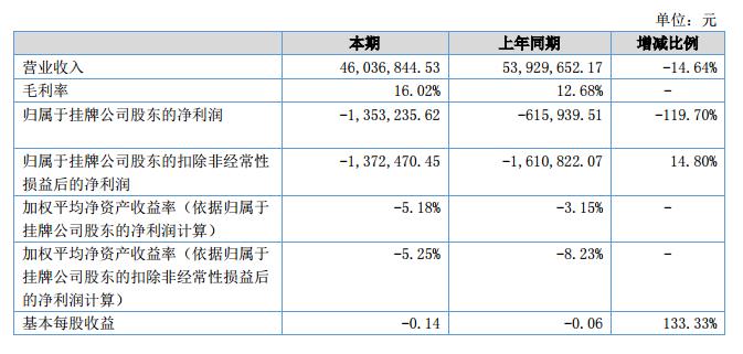 公司2018年1-6月實(shí)現(xiàn)營(yíng)業(yè)收入46,036,844.53元,較上年同期下降14.64%;營(yíng)業(yè)成本38,661,824.03元,較上年同期減少17.9%;毛利率為16.20%,比去年同期增加26.34%。?