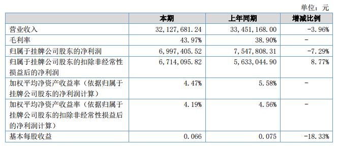 報(bào)告期內(nèi),公司實(shí)現(xiàn)營業(yè)收入32,127,681.24元,比去年同期下降3.96%,歸屬母公司凈利潤6,997,405.52元,比去年同期下降7.29%。?