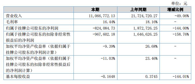 報告期內(nèi),公司實現(xiàn)營業(yè)收入11,066,772.13元,上年同期營業(yè)收入21,724,720.27元,較上年同期減少49.06%;報告期內(nèi),公司營業(yè)成本9,247,390.28元,上年同期營業(yè)成本17,779,915.35元,較上年同期減少47.99%;報告期內(nèi),公司凈利潤-824,084.73元,上年同期凈利潤1,872,726.25元,較上年同期減少144.00%,?