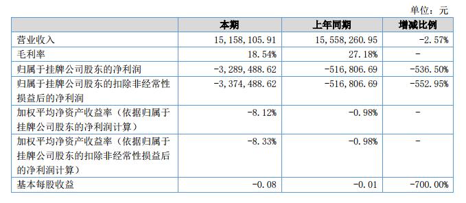 報告期內(nèi)公司實(shí)現(xiàn)營業(yè)收入1,515.81萬元,較去年同期下降2.57%,凈利潤-328.95萬元,較去年同期下降536.50%。毛利率為18.54%,去年同期27.18%,同比下降31.79%。?