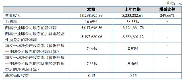報(bào)告期內(nèi),公司主營業(yè)務(wù)收入18,298,925.39元,較去年同期5,233,282.61元上漲13,065,642.78元,漲幅為249.66%;公司凈利潤-5,017,696.56元,較去年同期-6,124,664.76元,減少虧損額1,106,968.20元。