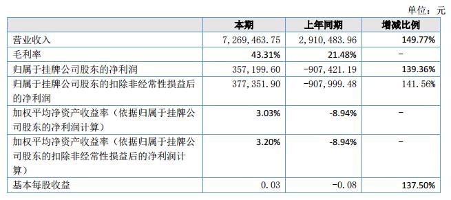 報(bào)告期內(nèi)公司營(yíng)業(yè)收入為726.95萬元,較去年同期上升了149.77%;營(yíng)業(yè)成本為412.11萬元,較去年同期上升了80.33%;毛利率為43.31%,較去年同期上升了101.63%。?