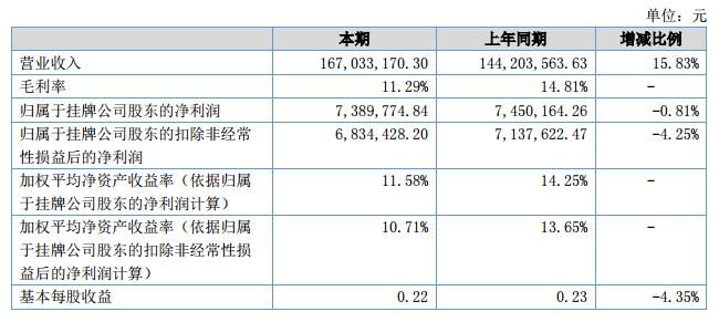 報告期內公司銷售167,033,170.30元與去年同期相比增長15.83%;報告期內實現(xiàn)凈利潤7,389,774.84元與去年同期相比下降0.81%。