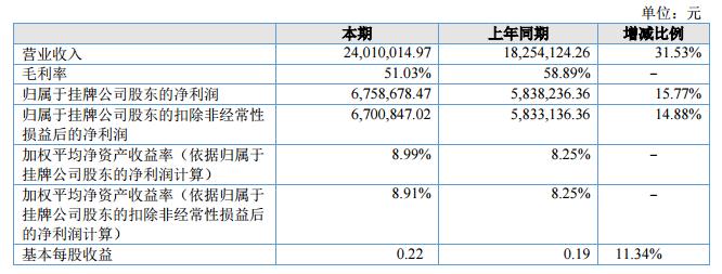報告期內(nèi)公司實現(xiàn)營業(yè)收入24,010,014.97元,比上年同期增長31.53%,公司實現(xiàn)凈利潤6,758,678.47元,比上年同期增長15.77%。?
