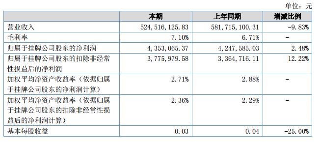 挖貝網(wǎng)9月11日,中天集團(證券代碼:871407)近日公布的2018年半年報顯示,截至2018年6月30日,企業(yè)實現(xiàn)營收5.25億元;歸屬于掛牌公司股東的凈利潤為435.3萬元。