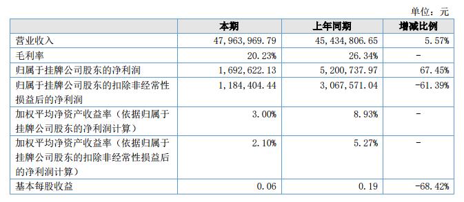 報(bào)告期內(nèi),公司營(yíng)業(yè)收入為4,796.40萬(wàn)元,較上年同期增加5.57%。公司的歸屬于掛牌公司股東的凈利潤(rùn)為169.26萬(wàn)元,較上年同期減少了67.45%,主要原因是外匯匯率的不利變動(dòng),以及去年同期新三板掛牌的政府一次性補(bǔ)助210萬(wàn)元,占去年同期凈利潤(rùn)比重較大。公司的營(yíng)業(yè)總成本為4,840.57元,較上年同期增加14.28%,毛利率為20.23%,較上年下降了6.11%,主要源于報(bào)告期內(nèi)的外匯匯率一直比較低。?