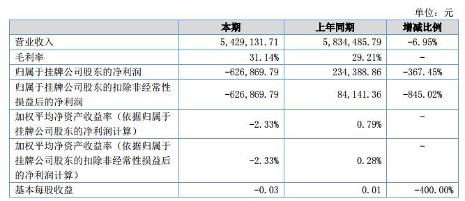 報告期內公司主營業(yè)務收入構成穩(wěn)定,未發(fā)生重大變動,主營業(yè)務收入542.91萬元,同比降幅6.95%;實現(xiàn)凈利潤-62.69萬元,比去年同期降幅-367.45%。?