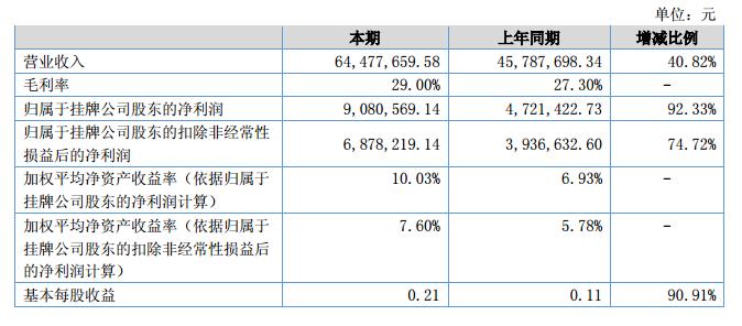 報告期內(nèi)公司實現(xiàn)營業(yè)收入6,447.77萬元,較上年同期4,578.77萬元有所上升,上漲幅度為40.82%;營業(yè)成本4,577.68萬元,較上年同期3,328.65萬元上升37.52%;鑒于營業(yè)收入上升幅度超過營業(yè)成本的上升幅度,毛利率由2017年1-6月的27.30%上漲至2018年1-6月的29.00%,毛利率上漲主要因為公司不斷地加大研發(fā)投入,推出新產(chǎn)品,提高公司服務(wù)質(zhì)量和行業(yè)的競爭力,降低公司的營業(yè)成本,從而使得綜合毛利率上升。2018年上半年實現(xiàn)凈利潤908.06萬元,較上年同期472.14萬元上升92.33%,2018年1-6月總費用占營業(yè)收入88.51%,與去年同期占比稍微下降。2?