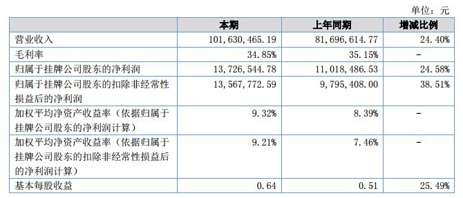 報(bào)告期內(nèi),公司實(shí)現(xiàn)營(yíng)業(yè)收入10,163.05萬元,相較上年同期的8,169.66萬元,同比增長(zhǎng)24.40%;公司實(shí)現(xiàn)凈利潤(rùn)1,372.65萬元,相較上年同期的1,101.85萬元,同比上升24.58%。?