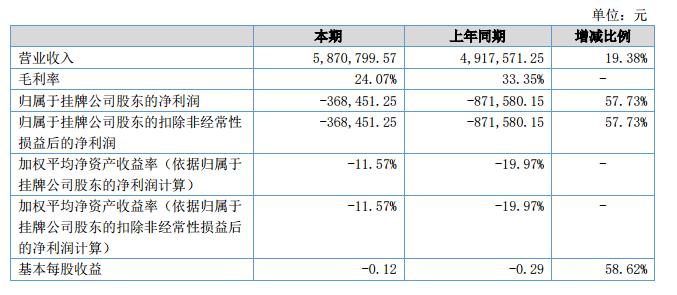 報告期內,公司實現營業(yè)收入5,870,799.57元,同比增長19.38%;凈利潤-368,451.25元,同比增長57.73%,主要原因是2018年上半年銷售額較2017年上半年增長19.38%,虧損明顯降低所致。?