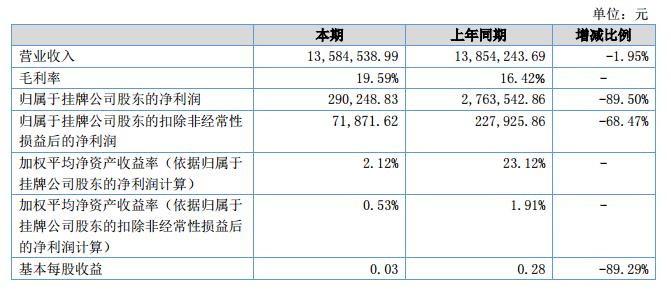 公司在2018年主營(yíng)業(yè)務(wù)保持平穩(wěn),實(shí)現(xiàn)營(yíng)業(yè)收入1358.45萬(wàn)元,較上年同期下降26.97萬(wàn)元,降幅1.95%,公司上半年出口銷售數(shù)量較上年同期略有增加,但是公司對(duì)于不同客戶給與不同的銷售折扣,由于公司的客戶集中度增加,大型客戶的銷售占比增加,銷售單價(jià)相對(duì)變低,致使銷售額未能同比增加。公司2018年上半年實(shí)現(xiàn)凈利潤(rùn)29.02萬(wàn)元,較上年大幅下降,主要是由于公司取得的政府補(bǔ)助大幅減少。?