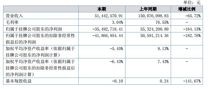 報(bào)告期內(nèi)公司實(shí)現(xiàn)營業(yè)收入5,144.26萬元,較上年同期15,007.61萬元下降9,863.35萬元;歸屬于母公司的凈利潤為-3,549.27萬元,較上年同期5,532.42萬元下降9,081.69萬元。