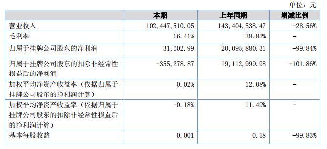 報(bào)告期內(nèi)公司實(shí)現(xiàn)營(yíng)業(yè)收入1.02億元,較上年同期1.43億,同比下降28.56%;凈利潤(rùn)3.16萬(wàn)元,較上年同期2009.58萬(wàn)元,同比下降99.84%。