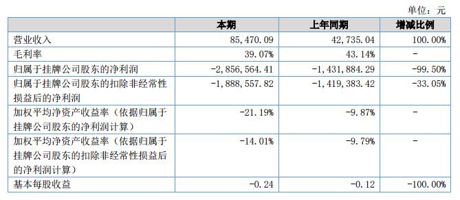 報告期內(nèi),公司共實現(xiàn)營業(yè)收入85,470.09元,較上年同期增加100.00%;公司共實現(xiàn)凈利潤-2,856,564.41元,較上年同期下降99.50%;經(jīng)營活動產(chǎn)生的現(xiàn)金流量凈額-5,764,418.62元,較上年同期下降236.30%。?