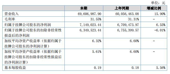報(bào)告期內(nèi),公司實(shí)現(xiàn)營(yíng)業(yè)收入69,606,987.90元,比去年同期增長(zhǎng)15.9%,實(shí)現(xiàn)歸屬于掛牌公司股東的凈利潤(rùn)7,149,023.44元。?