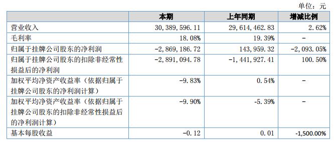 報告期內(nèi)公司總資產(chǎn)90,263,475.83元,較上年年末減少7.60%;負債總額為62,498,803.79元,較上年年末減少6.79%;所有者權(quán)益為27,764,672.04元,較上年年末減少9.73%。報告期內(nèi)公司實現(xiàn)營業(yè)收入30,389,596.11元,較上期增長2.62%,歸屬于掛牌公司股東的凈利潤-2,869,186.72元,較上期減少2,093.05%。?