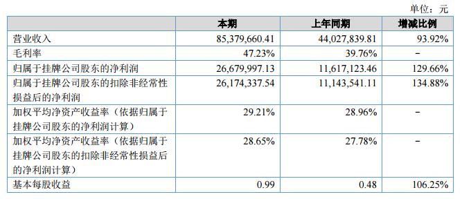 報(bào)告期內(nèi),公司營(yíng)業(yè)收入85,379,660.41元,與上年同期44,027,839.81元的營(yíng)業(yè)收入相比,增長(zhǎng)了93.92%。公司凈利潤(rùn)26,679,997.13元,與上年同期相比凈利潤(rùn)增長(zhǎng)129.66%,實(shí)現(xiàn)了大幅提高。為了能夠提供高效、精準(zhǔn)的三維無(wú)損光學(xué)視覺(jué)檢測(cè)系統(tǒng),公司的研發(fā)投入逐年加大,以保證產(chǎn)品技術(shù)的進(jìn)一步提升。報(bào)告期,公司研發(fā)費(fèi)用支出1,940,401.76元,完成了公司制定的研發(fā)項(xiàng)目預(yù)期進(jìn)度,公司產(chǎn)品的市場(chǎng)占有率也伴隨銷(xiāo)售收入的增長(zhǎng)而進(jìn)一步提高。?