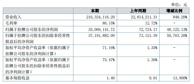 報告期內公司實現營業(yè)收入216,324,116.20元,相對上年同期增加848.20%;報告期實現合并歸屬于掛牌公司股東的凈利潤35,069,141.72元,相對上年同期增加48,122.13%。?