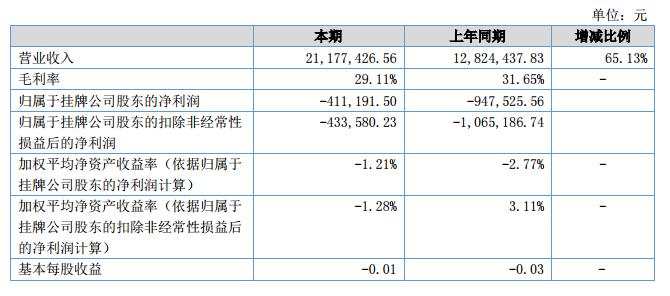 報告期內(nèi),公司實現(xiàn)營業(yè)收入2,117.74萬元,同比增長65.13%。凈利潤為-41.12萬元,相比同期虧損有所收窄。?