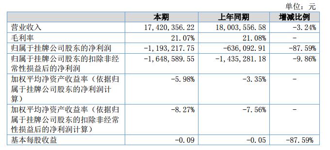 報(bào)告期內(nèi),公司實(shí)現(xiàn)營(yíng)業(yè)收入1,742.04萬(wàn)元,較上年同期1,800.35萬(wàn)元減少3.24%;其中主營(yíng)業(yè)務(wù)較上年同期減少52.92萬(wàn)元,同比下降2.98%(機(jī)器人及系統(tǒng)集成收入同比下降2.15%,自動(dòng)化元器件分銷(xiāo)業(yè)務(wù)收入同比下降4.48%)。凈利潤(rùn)為-119.32萬(wàn)元,較上年同期-63.60萬(wàn)元降低87.59%。?