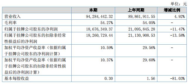 2018年上半年營業(yè)收入94,284,442.32元,比去年同期增長了4.92%,凈利潤18,676,349.37元,比去年同期降低了11.47%。凈利潤下降的原因主要是2018年研發(fā)費用增加,去年同期研發(fā)費用為5,020,426.04元,本年研發(fā)費用為11,854,214.10元,增加了6,833,788.06元。?