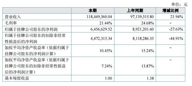報(bào)告期內(nèi)公司實(shí)現(xiàn)營業(yè)收入118,449,360.04元,較上年同期增加21.94%,主要原因是公司品質(zhì)穩(wěn)定,客戶市場份額持續(xù)擴(kuò)大原因;凈利潤6,114,069.32元,較上年同期8,430,805.42元,利潤率下降27.48%?