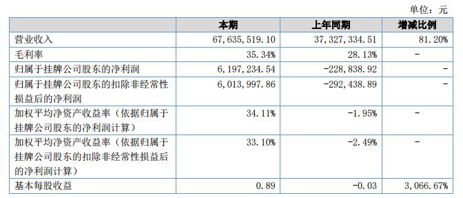 本期公司營(yíng)業(yè)收入67,635,519.10元,上年同期為37,327,334.51元,同比增加81.20%;公司本期凈利潤(rùn)6,197,234.54元,上年同期為-228,838.92元,,主要原因是本期業(yè)務(wù)量增加,銷(xiāo)售毛利大幅增長(zhǎng)導(dǎo)致。?
