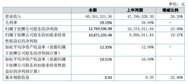 報(bào)告期內(nèi)公司銷售收入60,341,331.36元,比上期同比增長(zhǎng)26.26%,本期銷售凈利潤(rùn)12,769,596.98元,比上期同比增長(zhǎng)23.08%。?