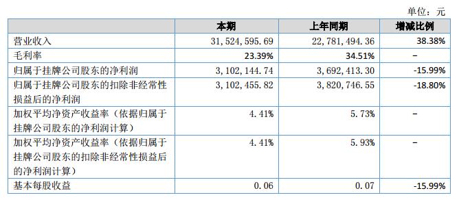公司實現(xiàn)營業(yè)收入3152.46萬元,較上年同期增長38.38%;凈利潤304.86萬元,較上年同期減少59萬元。?