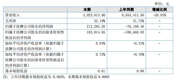 報(bào)告期內(nèi),公司實(shí)現(xiàn)營(yíng)業(yè)收入4,923,613.80元,較上期減少了26.01%,從報(bào)告期內(nèi)經(jīng)營(yíng)情況來(lái)看,公司主要客戶未發(fā)生大變化,產(chǎn)品毛利率由21.72%增長(zhǎng)至32.19%發(fā)生明顯變化。?