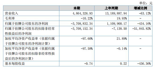 報(bào)告期內(nèi)公司實(shí)現(xiàn)營業(yè)收入4,864,326.93元,較上年同期下降63.12%;公司實(shí)現(xiàn)凈利潤-3,708,832.34元,較上年同期下降434.16%。?