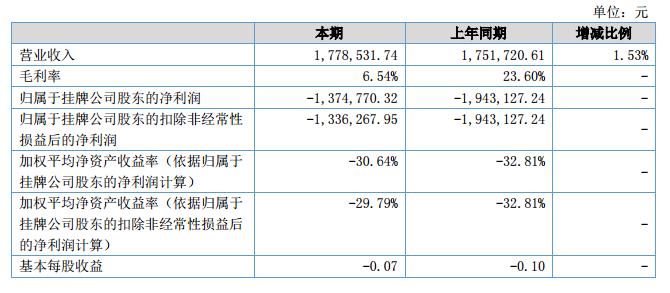 報(bào)告期內(nèi)公司實(shí)現(xiàn)營(yíng)業(yè)收入1,778,531.74元,較上年同期增長(zhǎng)1.53%;報(bào)告期內(nèi)公司產(chǎn)生營(yíng)業(yè)成本1,662,293.43元,較上年同期增加24.21%;公司實(shí)現(xiàn)凈利潤(rùn)-1,374,770.32元,較上期增加568,356.92元。?