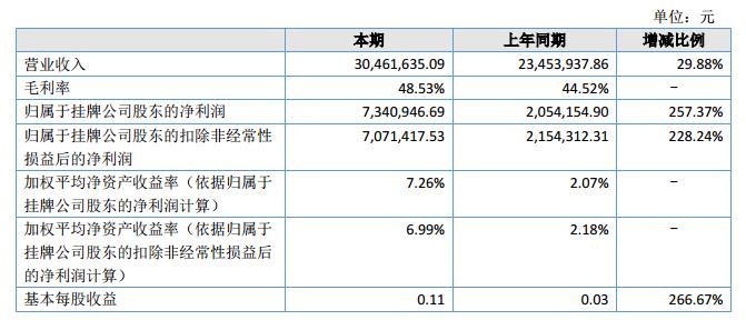 報告期內(nèi),公司實現(xiàn)營業(yè)收入3,046.16萬元,相比上年同期有所上升,上升了29.88%,營業(yè)總成本2,322.85萬元,較上年同期也有所上升,上升了14.89%,利潤總額為755.49萬元,同比增長181.97%,歸屬于母公司股東的凈利潤734.09萬元,同比增長257.37%?