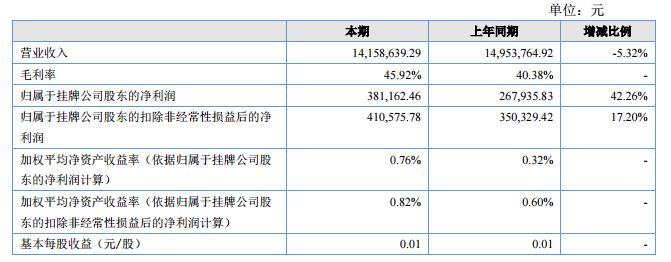 報告期內(nèi),公司實現(xiàn)營業(yè)收入1,415.86萬元,比上年同期下降了5.32%;本期毛利率45.92%與上年同期40.38%上升了5.54%;本期凈利潤-52.99萬元,比上年同期下降了297.80%。