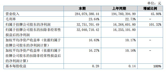 報告期內(nèi),公司營業(yè)收入284,079,380.44元,較去年同期上升45.86%;報告期內(nèi),公司營業(yè)成本216,915,486.52元,較去年同期增長44.14%;公司凈利潤為33,827,883.45元,較去年同期增加16,589,396.29元,大幅增長96.23%?。