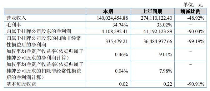 報(bào)告期內(nèi),公司實(shí)現(xiàn)營業(yè)收入140,024,454.88元,同比下降48.92%;歸屬于母公司所有者的凈利潤4,108,592.41元,同比下降90.03%;歸屬于母公司所有者的扣除非經(jīng)常性損益后的凈利潤335,479.21元,同比下降99.19%。截至2018年06月30日,歸屬于母公司所有者凈資產(chǎn)897,179,721.37元,同比上升0.46%。?