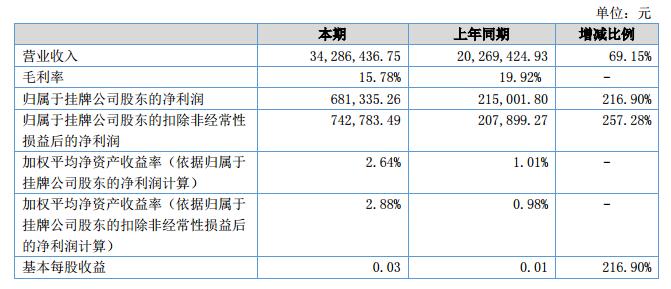 報(bào)告期內(nèi),公司的經(jīng)營模式和主營業(yè)務(wù)未發(fā)生改變,在2018年1-6月期間,實(shí)現(xiàn)營業(yè)收入34,286,436.75元,較上年同期增長69.15%,凈利潤為681,335.26元,較上年同期增加216.90%。?